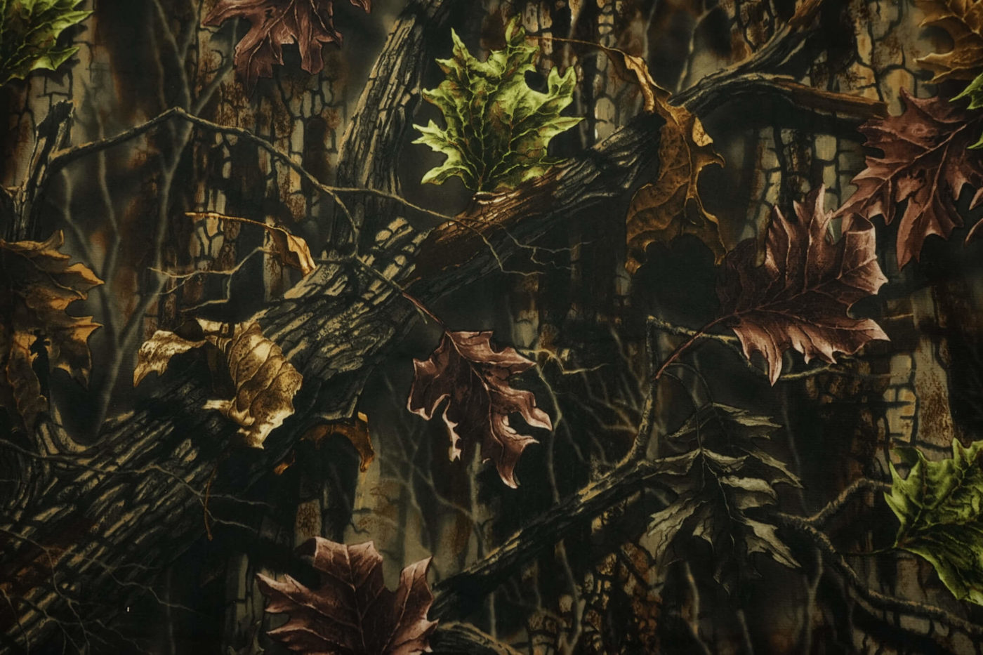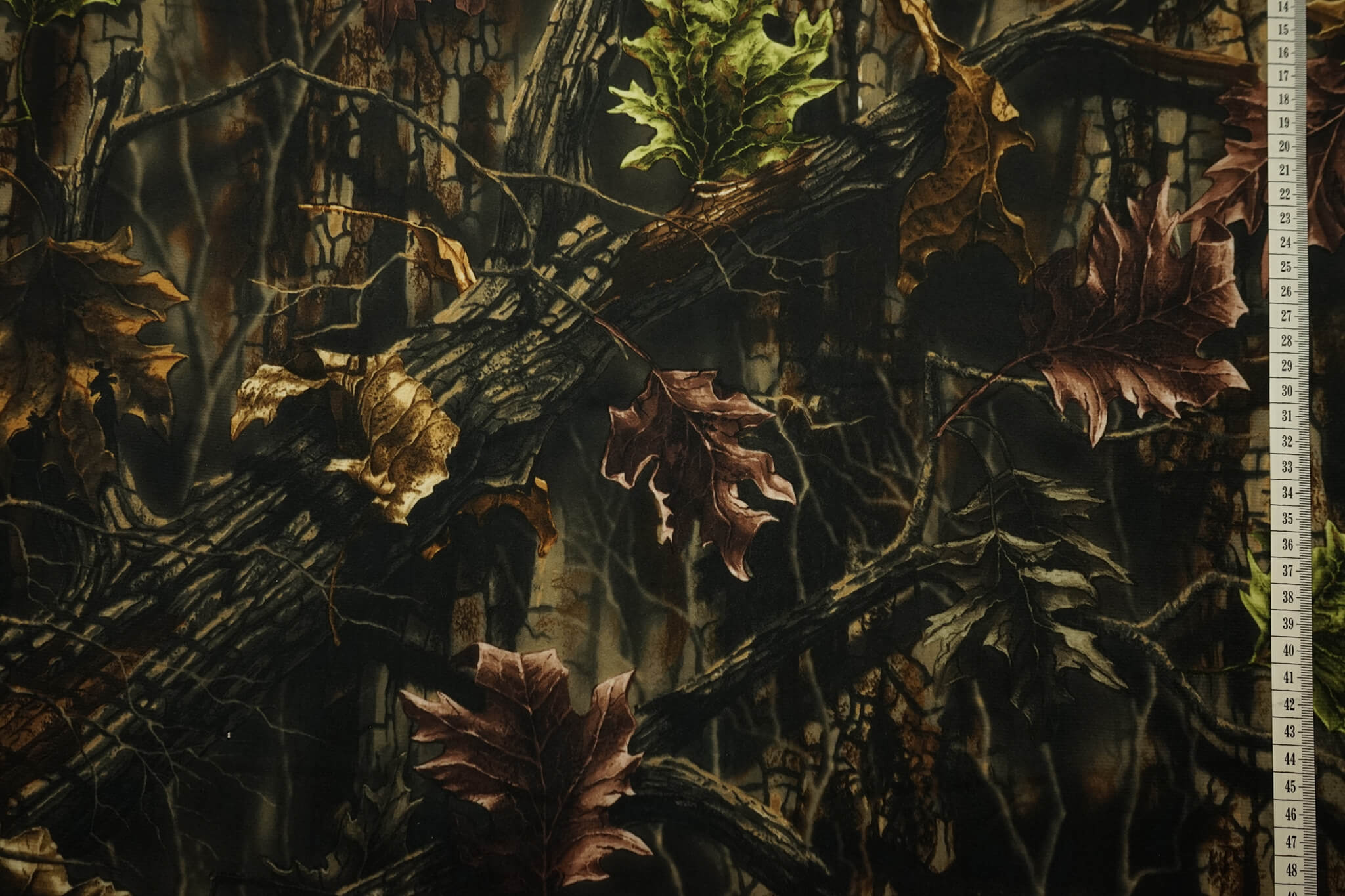 Wyrazisty wzór kamuflażu typu RealTree z fotorealistycznym motywem gałęzi, liści dębu i kory drzew w odcieniach brązu, oliwki i zieleni. Nadruk imituje prawdziwe leśne otoczenie, zapewniając skuteczne wtopienie się w naturalny teren. Materiał wykonany w 100% z poliestru o gramaturze 195 g/m² posiada membranę wodoodporną, dzięki czemu chroni przed wilgocią i lekkim deszczem, pozostając przy tym wytrzymały i łatwy w pielęgnacji.