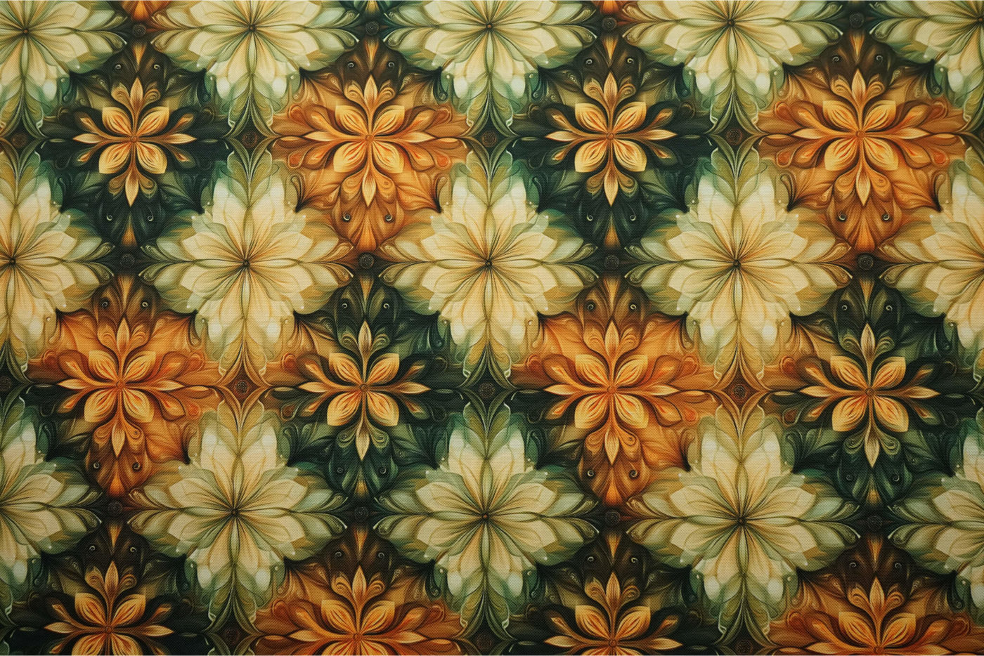 Wytrzymała tkanina ogrodowa z efektownym wzorem przypominającym ornamentalne kwiaty w odcieniach beżu, złota i zieleni. Kolory są nasycone, ale przyjemnie stonowane – tworzą elegancki, nieco orientalny klimat. Materiał jest wodoodporny, dzięki czemu dobrze znosi warunki zewnętrzne i łatwo się czyści.