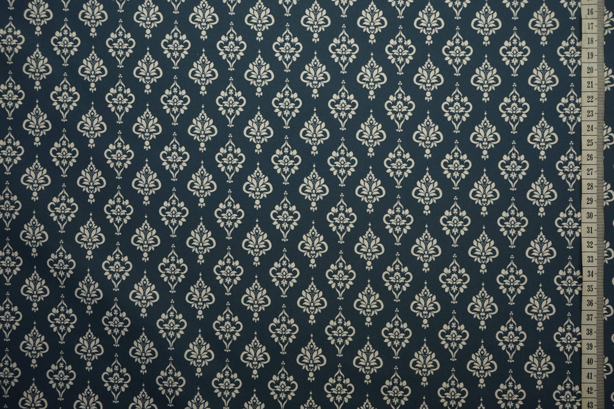 Tkanina sukienkowa w biały wzór na granacie. Została wyprodukowana z poliestrowych mikrowłókien wysokiej jakości. Sprawia to, że materiał jest miły w dotyku, nie tracąc przy tym swojej wytrzymałości. Tkanina jest lekko sztywna i staje się bardziej miękka już po pierwszym praniu. Wyróżnia się również bardzo trwałym nadrukiem, dzięki czemu może posłużyć przez długi czas.