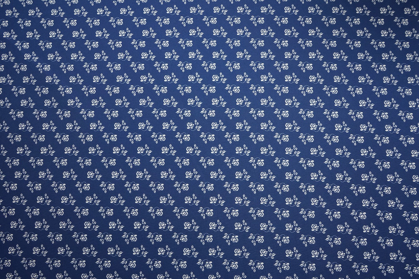 Tkanina sukienkowa w drobne kwiatki na niebieskim tle. Została wyprodukowana z poliestrowych mikrowłókien wysokiej jakości. Sprawia to, że materiał jest miły w dotyku, nie tracąc przy tym swojej wytrzymałości. Tkanina jest lekko sztywna i staje się bardziej miękka już po pierwszym praniu. Wyróżnia się również bardzo trwałym nadrukiem, dzięki czemu może posłużyć przez długi czas.