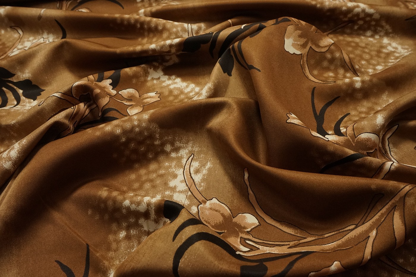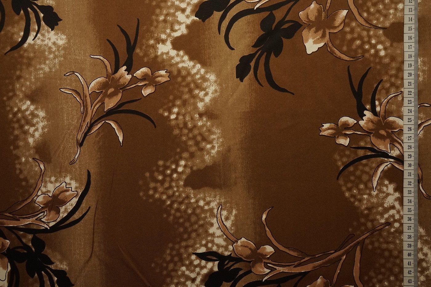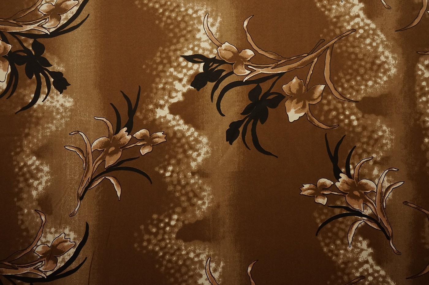 Tkanina sukienkowa w kwiaty na brązowym tle.