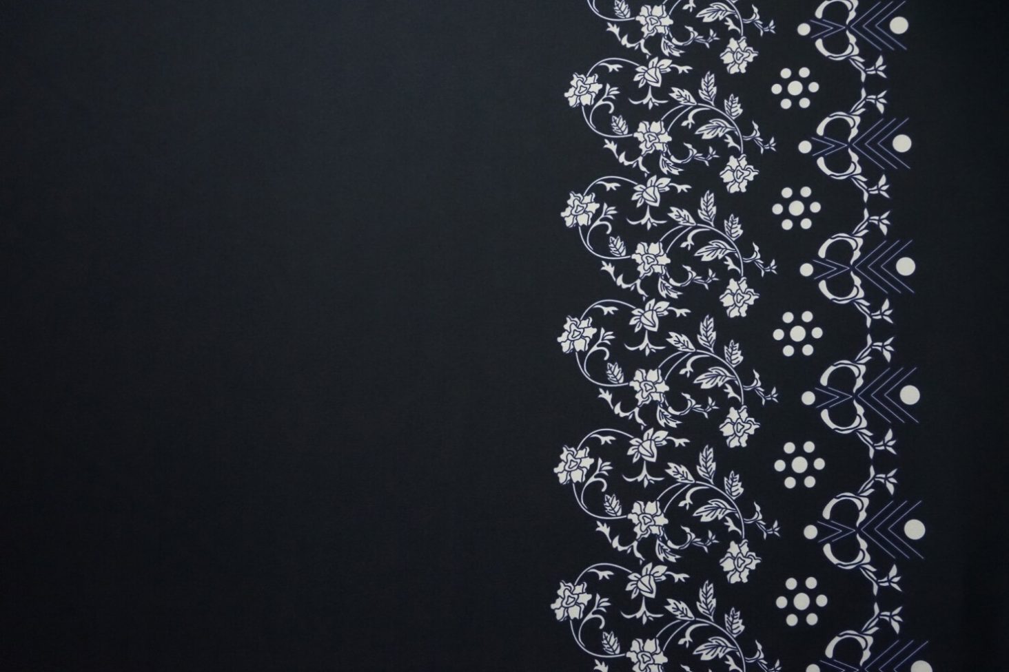 Tkanina regionalna w kolorze granatowym z wzorem po jednej stronie brzegu fabrycznego.