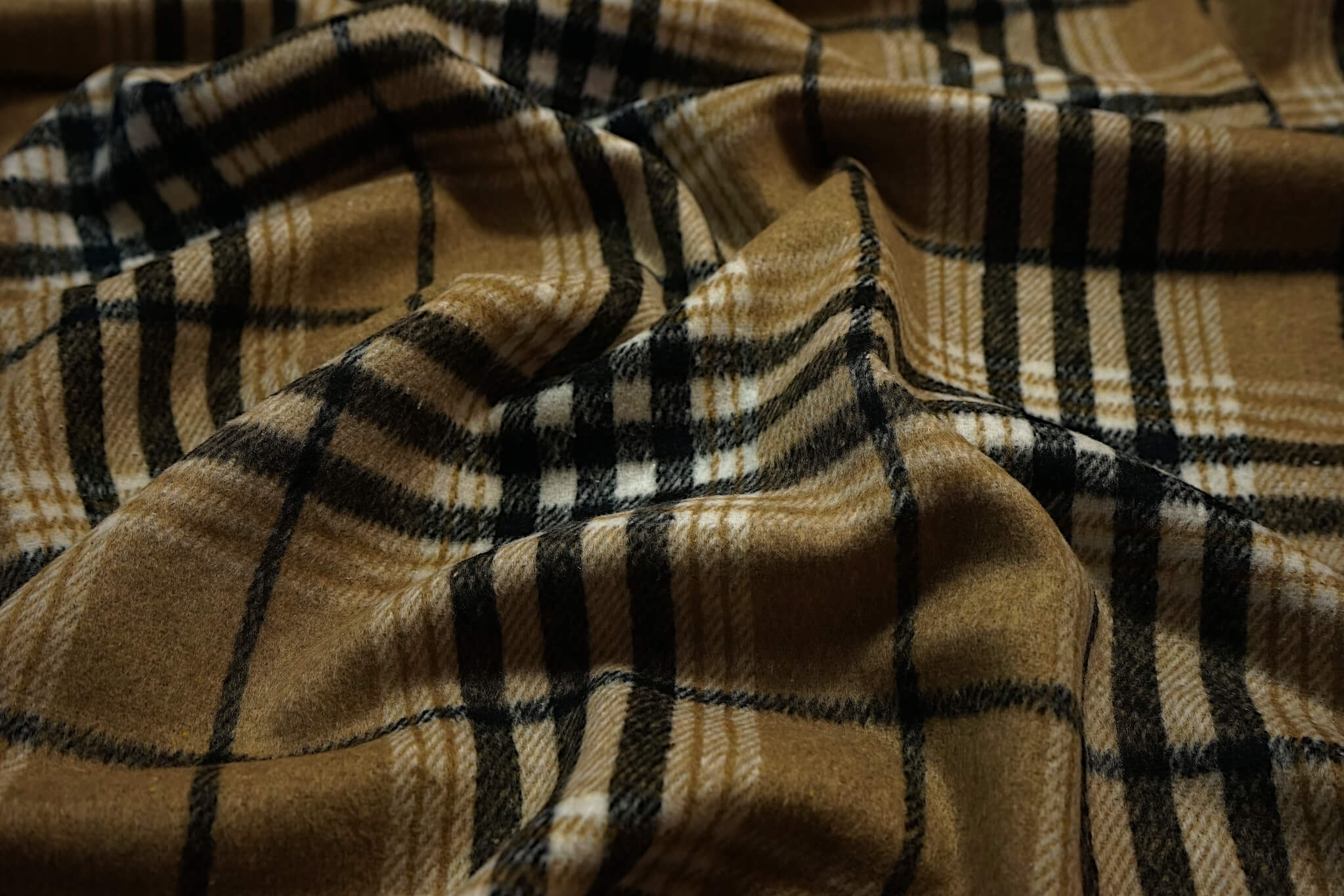 Materiał ma przyjemną, lekko meszkowatą powierzchnię i optymalną gramaturę 280 g/m², co sprawia, że świetnie układa się na sylwetce i nadaje projektom eleganckiej struktury. Klasyczna kratka w odcieniach beżu, czerni i bieli podkreśla ponadczasowy charakter tkaniny – idealny na jesień i zimę.
