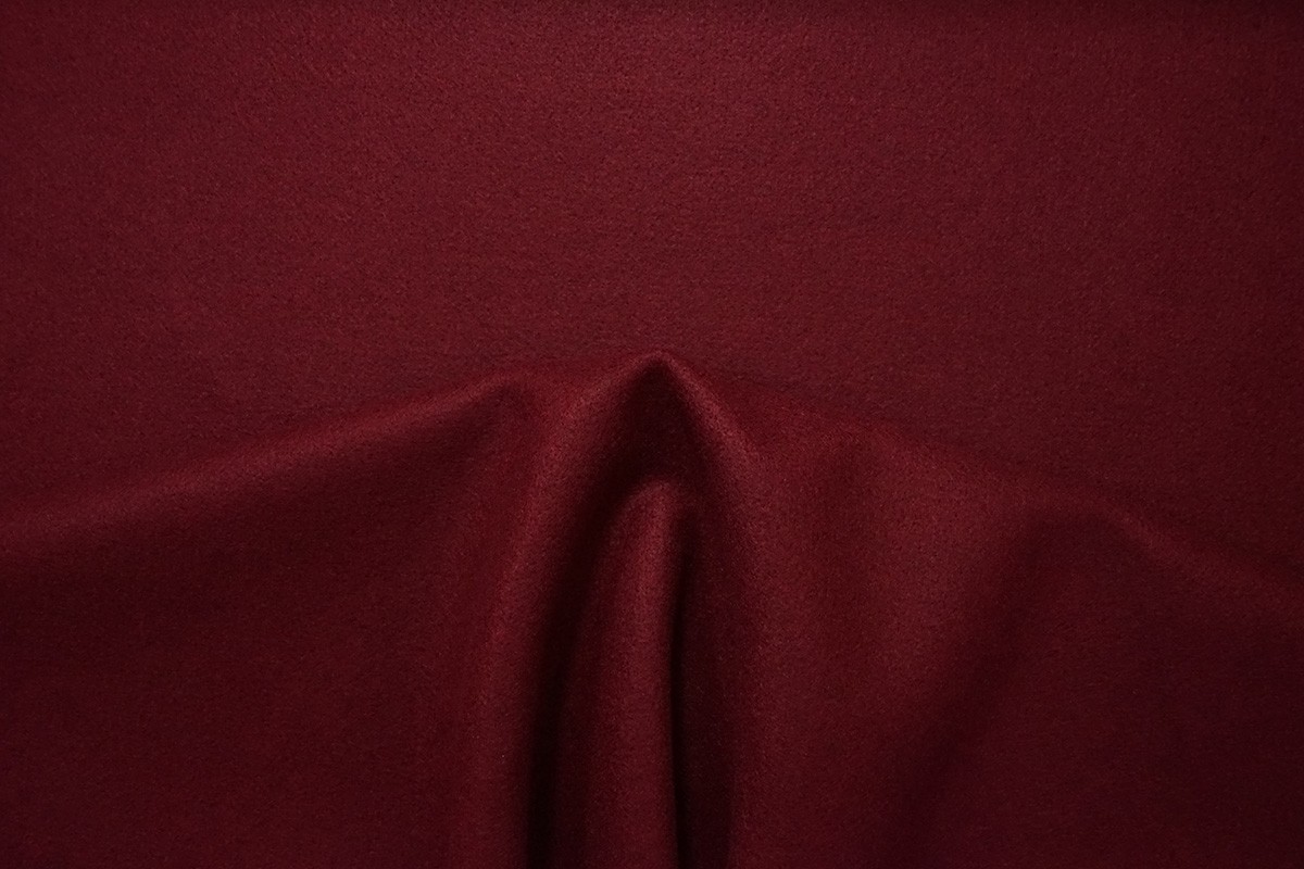 Tkanina wełniana w kolorze bordowym. Włóknami, które wchodzą w skład tkaniny wełnianej, jest naturalna wełna oraz włókna sztuczne. Wysoki komfort użytkowania zapewniony jest przez poliester, który zmniejsza uczucie gryzienia, z którego znana jest naturalna wełna. Tkanina wełniana jest również zdecydowanie prostsza w czyszczeniu i pielęgnacji, dlatego też uszyte z niej ubrania cieszą się wielosezonowością i wytrzymałością.